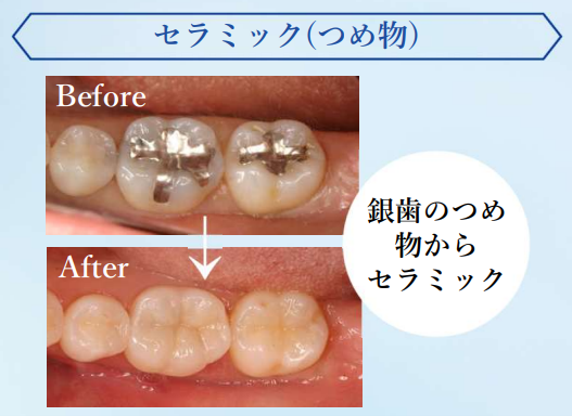 今までは金属を詰めたりかぶせたりしていましたが、最近は天然歯に合わせた色調のセラミックなどを用いた補綴物もあります。